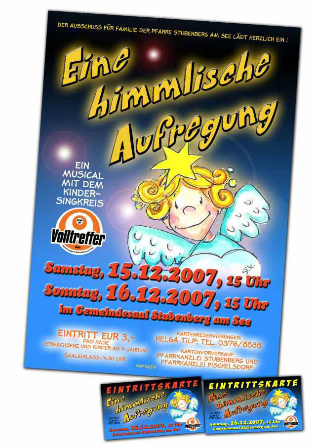 Gestaltung und Produktion der Drucksorten (Plakate, Flugblätter, Eintrittskarte) für eine Musical-Aufführung des Kindersingkreises "Volltreffer".