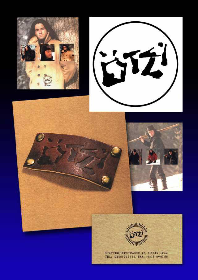 Unter dem Markennamen "ÖTZI" wurde strapazfähige, hochwertige Winterbekleidung hergestellt. Das Logo verknüpft den berühmten Mann aus dem Eis mit -